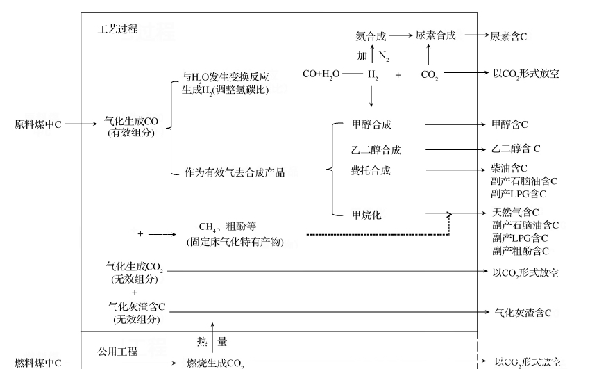 统计各子行业的排碳结构可知,现代煤化工全行业二氧化碳中,约33%来源于化石燃料燃烧排碳,约3.5%来源于外购电、热间接排碳,约63.5%来源于工艺过程排碳,工艺过程排碳主要是变换工序产生的CO2,在低温甲醇洗脱碳工序排放。